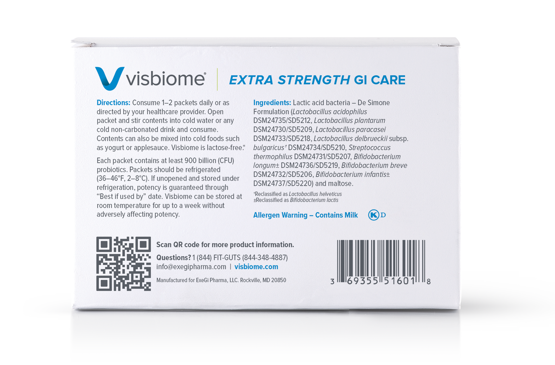 Visbiome is a high potency medical food probiotic intended for the dietary management of dysbiosis associated with Irritable Bowel syndrome (IBS), Ulcerative Colitis (UC), Antibiotic-Associated Diarrhea, and ileal pouch management.